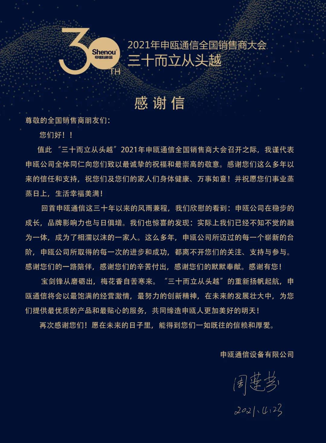 4月23日,申甌通信2021年“三十而立從頭越”全國(guó)銷售商大會(huì)在溫州金海岸開元度假村隆重召開。群英薈萃,共襄盛舉。威海泓金電子喜獲金點(diǎn)子獎(jiǎng)、年度金牌特約銷售商獎(jiǎng)。晚宴抽獎(jiǎng)環(huán)節(jié),喜中一等獎(jiǎng)。